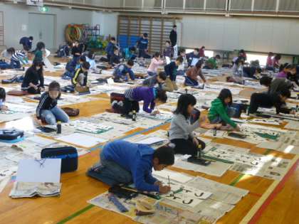 普段の教室とは違い、広い場所でみんながそろって書くことを