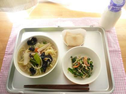 今日の献立は、チャンポン麺、野菜のごまだれかけ、