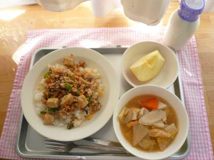 今日の献立は、高野豆腐のそぼろ丼、チゲ汁、りんご、牛乳です。