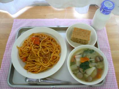 今日の献立は、ナポリタンスパゲティ、かぶと水菜のスープ、