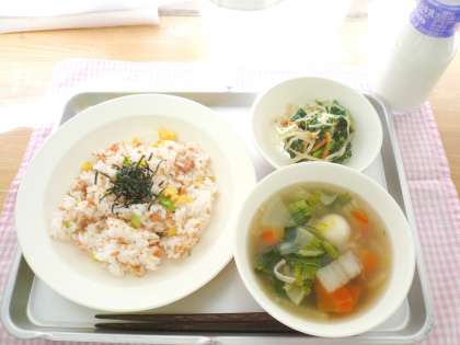 今日の献立は、鮭と卵の混ぜごはん、白玉汁、野菜のごまだれかけ、