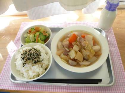 今日の献立は、ごはんとわかめのふりかけ、豚肉と大根のうま煮、