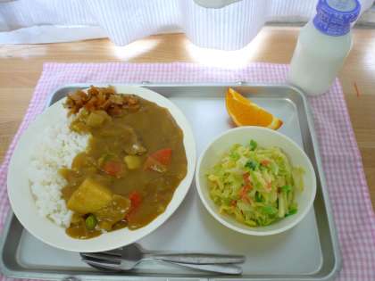 今日の献立は、カレーライス、キャベツサラダ、ネーブルオレンジ、