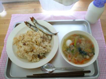 今日の献立は、中華おこわ、白菜と春雨のスープ、焼きししゃも、
