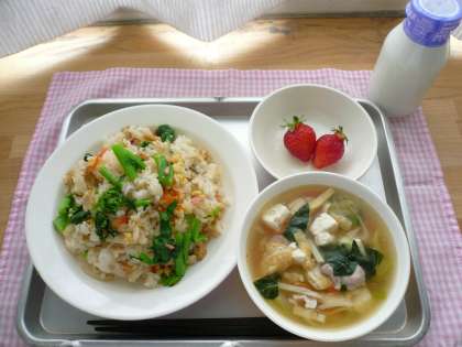 今日の献立は、菜の花ずし、吉野汁、いちご、牛乳です。