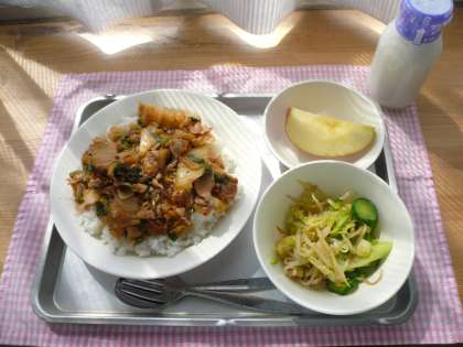 今日の献立は、キムチ丼、野菜の中華風味、りんご、牛乳です。