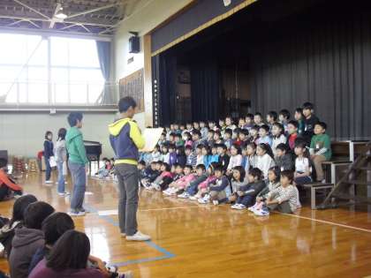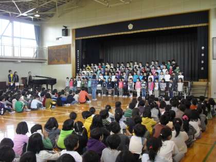 1年生の可愛らしい歌声を聞くと、全校児童が笑顔になりました。