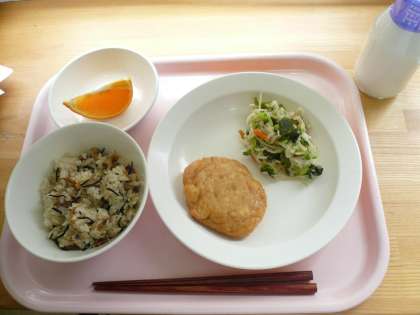 今日の献立は、ひじきごはん、おびでん、切干大根の酢の物、