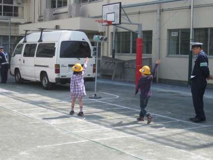 警察の方に道の歩き方、横断歩道の渡り方などを分かりやすく教えてもらい、実際に体験。手をピンとあげ、信号が青になっても周りをよく見ながら道路を渡る練習をしました。