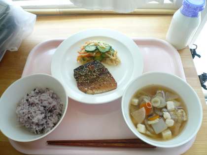 今日の献立は、黒米ごはん、さばの七味焼き、切干大根のサラダ、けんちん汁、牛乳です。