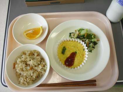 今日の献立は、じゃこの甘辛ごはん、チーズ入り卵焼き、和風サラダ、デコポン、牛乳です。
