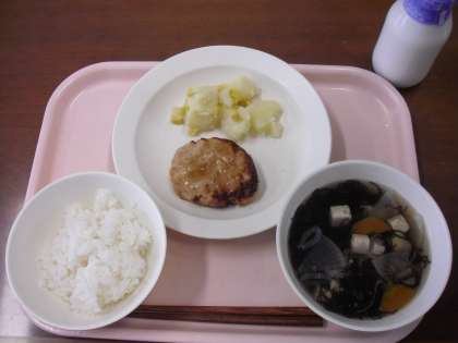 今日の献立は、ごはん、豆腐ハンバーグ、コーンポテト、もずくのすまし汁、牛乳です。