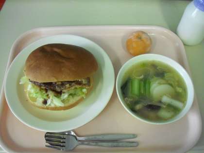 今日の献立は、セルフフィッシュサンド、トック入りピリ辛スープ、冷凍みかん、牛乳です。