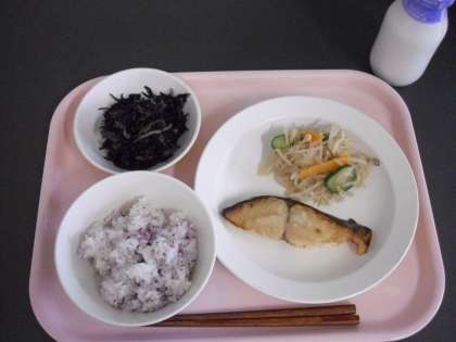 今日の献立は、ゆかりごはん、さわらの西京焼き、こんにゃくサラダ、ひじきの煮つけ、牛乳です。