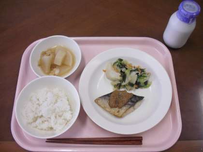 今日の献立は、ごはん、さばのごまだれかけ、和風サラダ、大根と油揚げの含め煮、牛乳です。