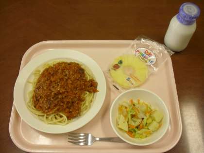 今日の献立は、ミートソーススパゲティ、ポテト入りフレンチサラダ、冷凍パイン、牛乳です。