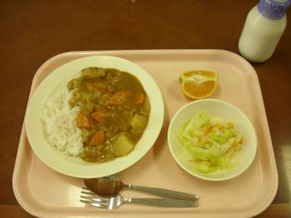 通常給食のカレーには豚肉を使っていますが、今日は鶏肉を使っています。