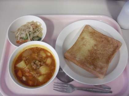 今日の献立は、シナモントースト、ポークビーンズ、こんにゃくサラダ、牛乳です。