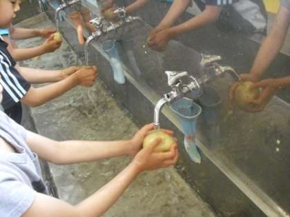 じゃがいもについた土を水で洗い流し、「美人なじゃがいもねっ。」と言う子供たち。