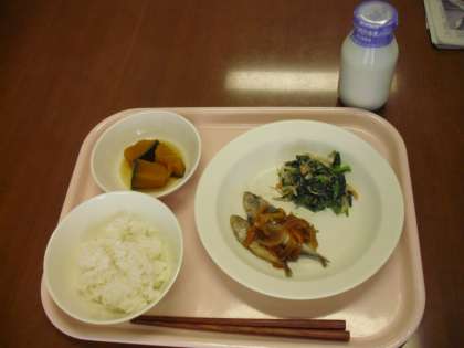 今日の献立は、ごはん、豆アジの南蛮漬け、かぼちゃの含め煮、野菜のごまだれかけ、牛乳です。