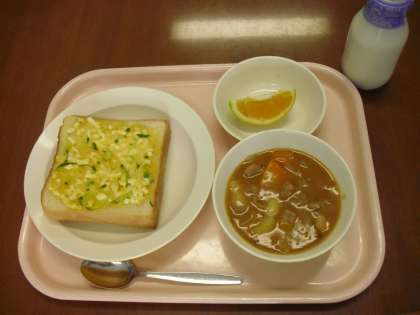 今日の献立は、たまごトースト、ビーンズシチュー、バレンシアオレンジ、牛乳です。