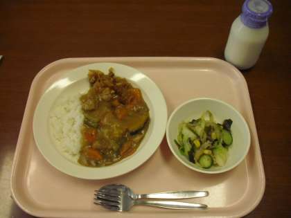 今日の献立は、夏野菜のカレーライス、糸寒天サラダ、福神漬け、牛乳です。