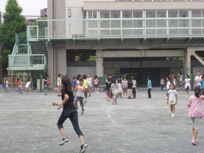 2学期が始まって1週間、ちょっと疲れが見え始める頃かと思いきや、校庭・屋上・体育館では元気いっぱい身体を動かしていました。教室ではイス取りゲームや、テニスラケットを使ったバランスリレー等、遊びを工夫していました。中でも、体育館では少人数教室チームvs家庭科室チーム対抗のドッジボールをしていましたが、低学年に配慮したルールを決め、柔らかいボールを使い、高学年は利き手じゃない手で投げていたようです。