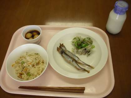 今日の献立は、とりめし、焼きししゃも、ゆかりあえ、月見だんご、牛乳です。