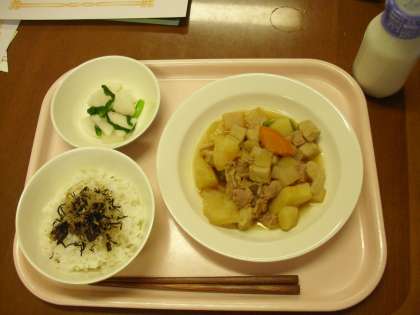 今日の献立は、ごはんとひじきのふりかけ、韓国風肉じゃがうま煮、かぶの甘酢づけ、牛乳です。