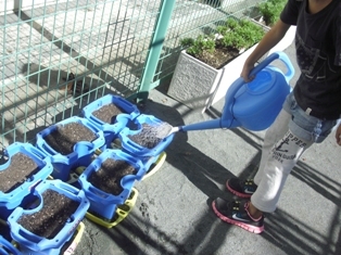ふかふかの土に小さな種をやさしく入れて、「大きくなってね。」と願いを込めながらお水をあげました。