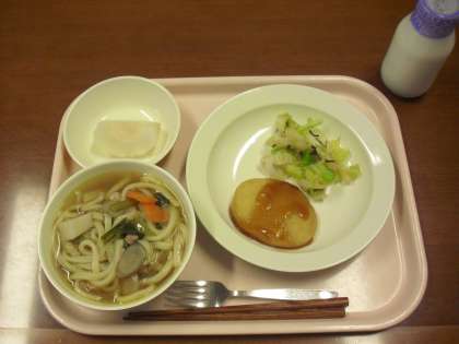 今日の献立は、けんちんうどん、キャベツの塩こんぶかけ、もちもちじゃがいも、なし、牛乳です。