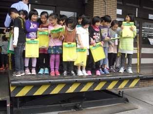 世田谷郵便局の1階部分で、集荷から戻った車から郵便物を局内に入れたり、局から車に入れたりするためのエレベーターに、1クラスずつ乗ることができました。