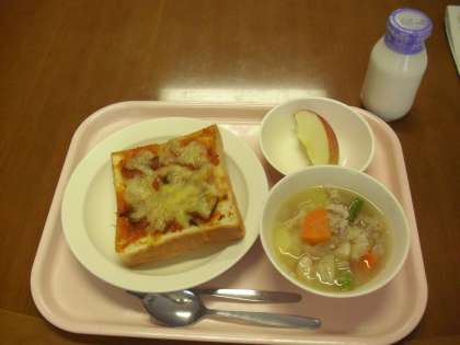 今日の献立は、ピザトースト、白いんげんの田舎風スープ、りんご、牛乳です。