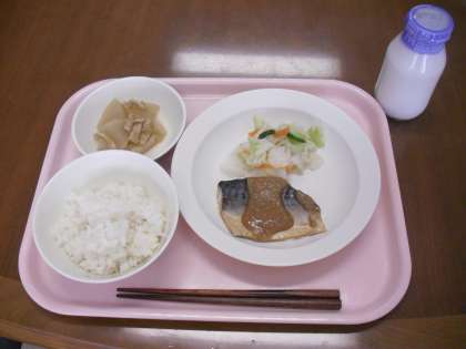 今日の献立は、ごはん、さばのごまだれかけ、野菜の甘酢あえ、大根と油揚げの含め煮、牛乳です。