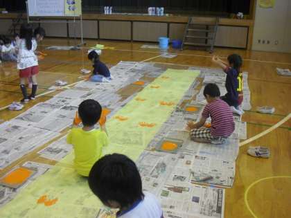 一人一人の両手をつばさに見立て、ながいながい不織布にスタンプしていくのです。