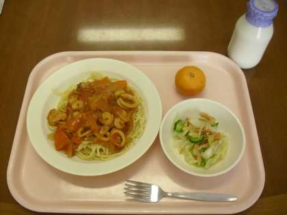 今日の献立は、地中海ソーススパゲティ、ごぼうチップサラダ、早生みかん、牛乳です。