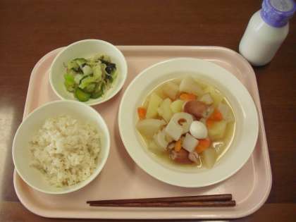 今日の献立は、茶めし、洋風おでん、わかめサラダ、牛乳です。