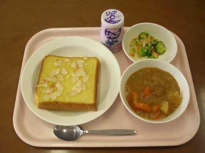 今日の献立は、はちみつレモンバタートースト、ポークシチュー、野菜のイタリアンドレッシングかけ、飲むヨーグルトです。