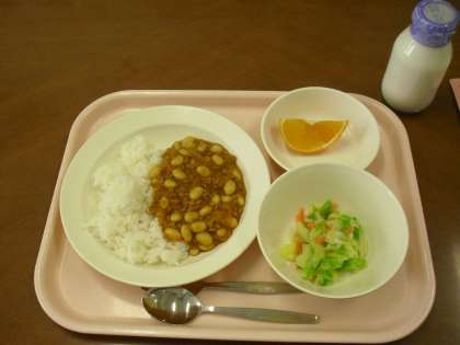 今日の献立は、ごはん、大豆のカレー煮、キャベツサラダ、紅マドンナ、牛乳です。