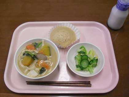 今日の献立は、ほうとう、黒砂糖入り蒸しパン、野菜のひと塩、牛乳です。