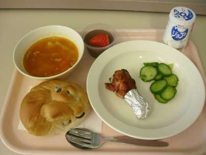 今日の献立は、ぶとうパン、小さなローストチキン、ピクルス、ミネストローネ、チョコプリン、飲むヨーグルトです。