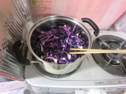 ムラサキキャベツをお湯で煮ると、色素が出て紫色のお湯になります。