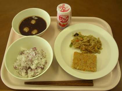 今日の献立は、ゆかりごはん、松風焼き、切干大根の煮つけ、白玉しるこ、飲むヨーグルトです。