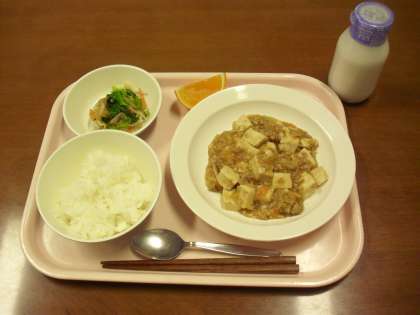 今日の献立は、ごはん、麻婆豆腐、ナムル、天草オレンジ、牛乳です。
