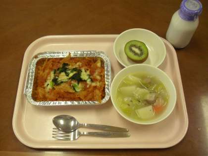 今日の献立は、ラザニア、ポトフ、キウイフルーツ、牛乳です。