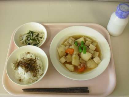 今日の献立は、ごはん、じゃがいものそぼろ煮、わかめサラダ、