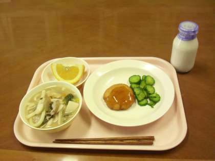 今日の献立は、みそ煮込みうどん、きゅうりの甘酢漬け、もちもちジャガイモ、