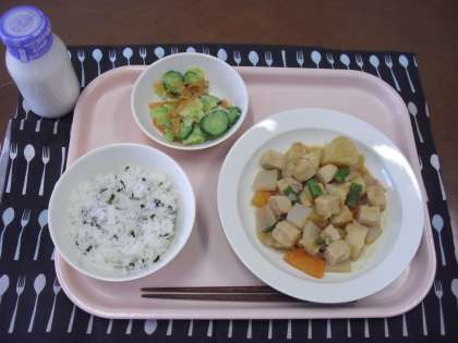 今日の献立は、わかめごはん・牛乳・韓国風肉じゃがうま煮・パリパリサラダ[写真上]です。