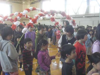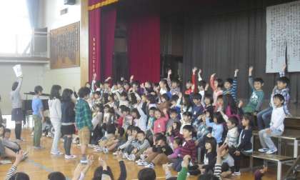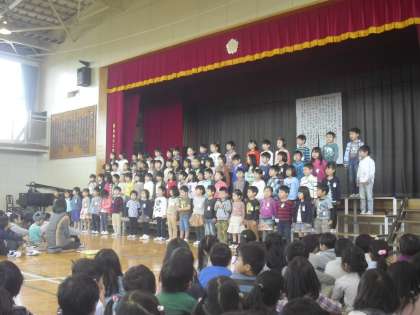 1年生からは、お礼に「どきどきどん!1年生」の歌の発表があり、その後、他の学年と同じように列に入り、「仲間入り」ができました。全校児童498人が、初めて全員そろって整列し、「ともだちになるために」を歌いました。