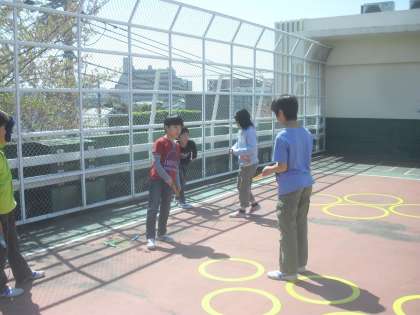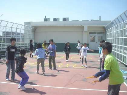 1回目の今日は、屋上で、なわとび名人たちが下級生たちになわとびを教える「なわとび教室」が開かれ、2年生や5年生がたくさん集まってきました。